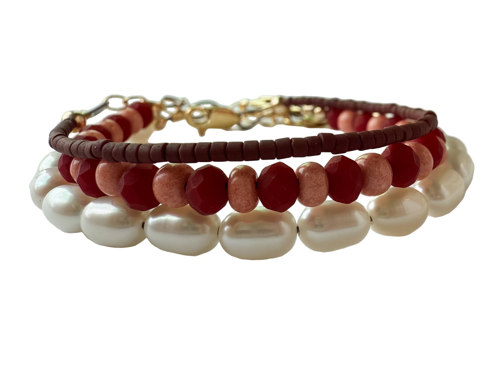 This bundle comes as a set of the three bracelets pictured. Made with high quality stainless steel cord and gold-filled components. Expect durability. Will not tarnish. Meant for daily wear. Water-safe.